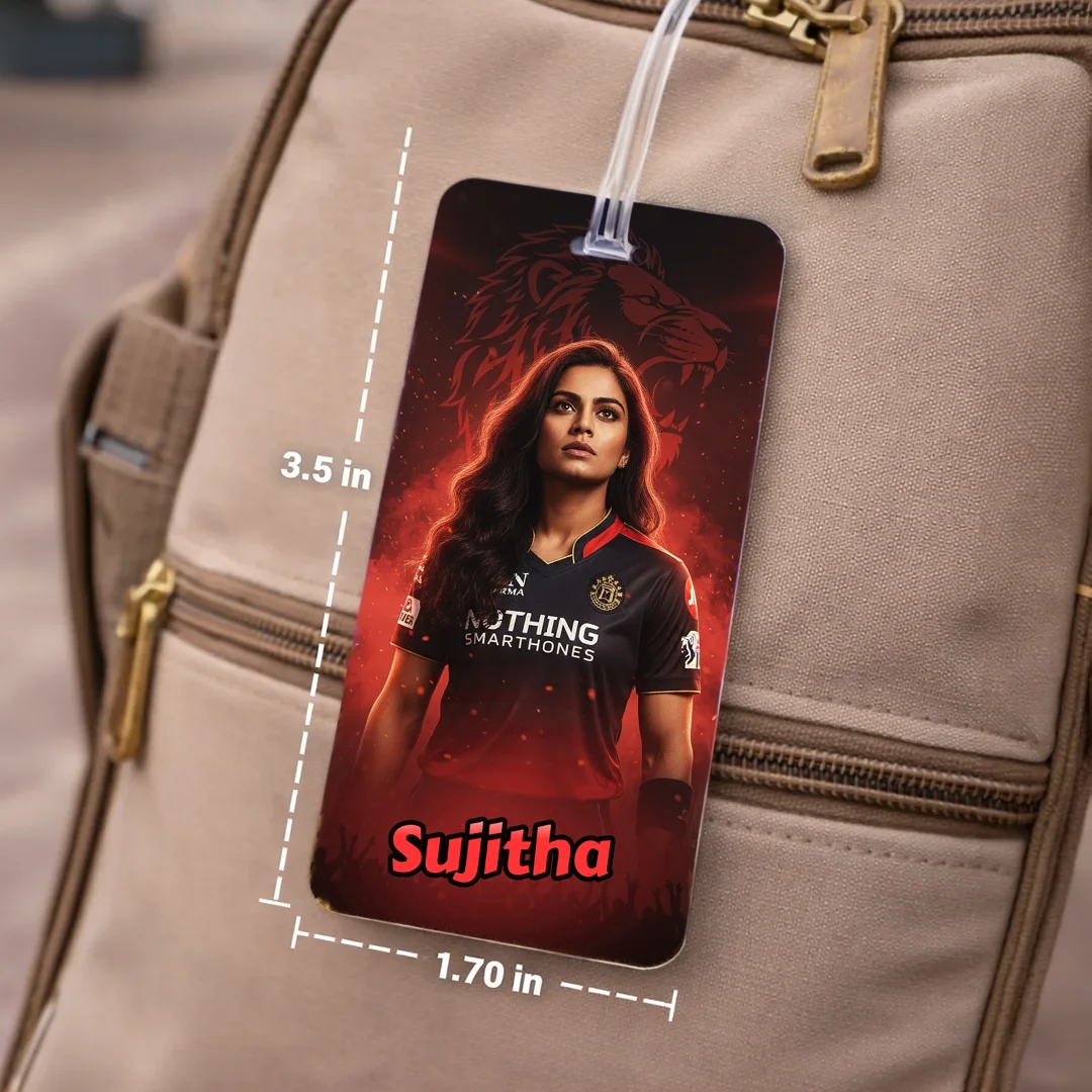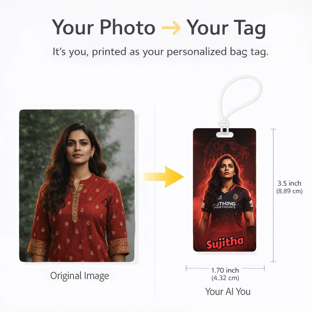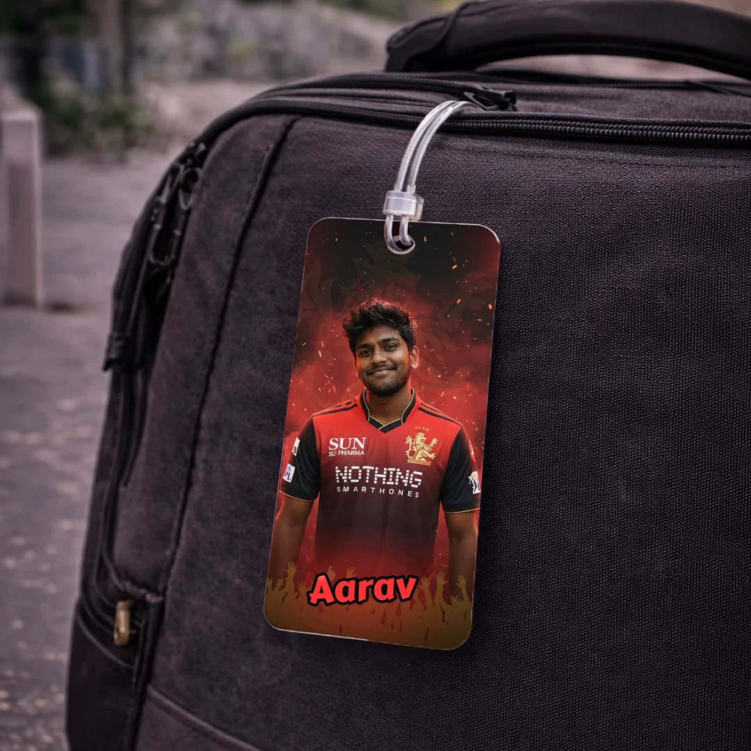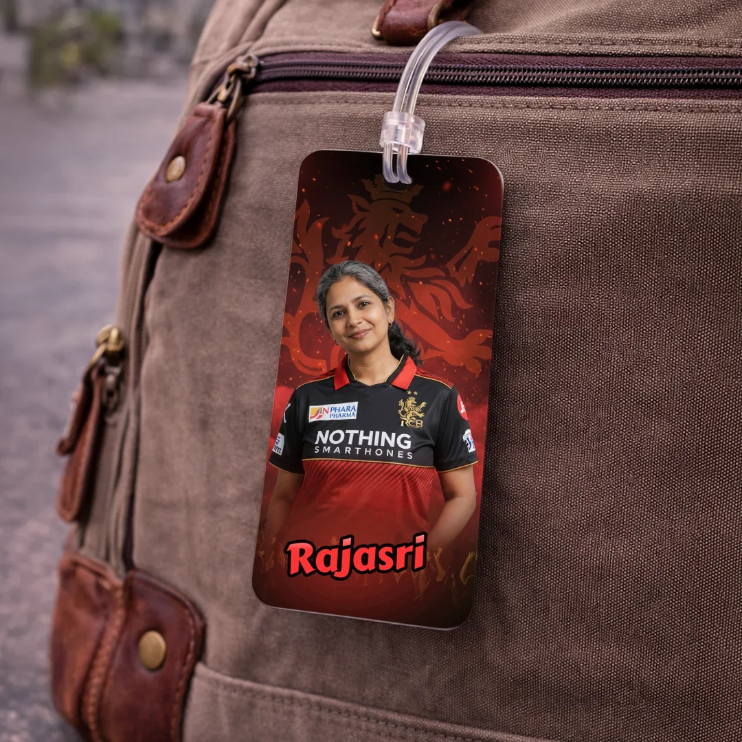 RCB Fan AI Luggage Tag – Royal Challengers Bengaluru Travel Tag, Customisable with Your AI Avatar and Name, Personalised Tag for Men, Women, Kids – IPL Cricket Team Merchandise